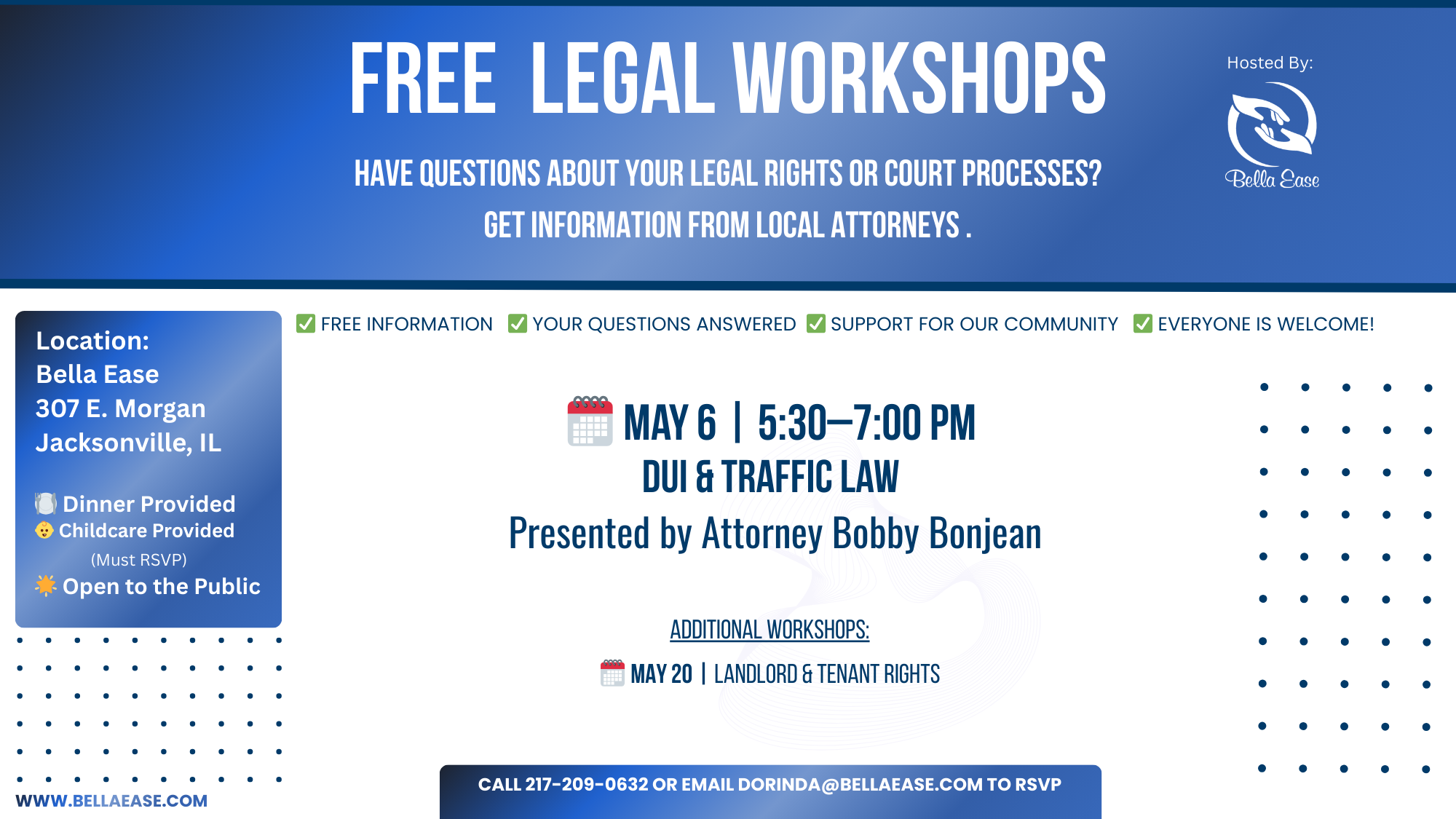 Everyone is welcome to join us for 4 Legal Workshops, where we discuss the court process and your legal rights with local attorneys.