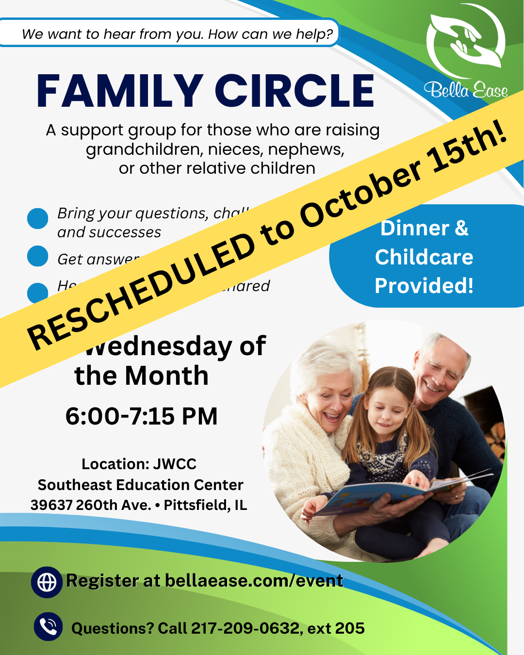 JWCC Southeast Education Center 39637 260th Ave, Pittsfield, IL, United StatesEVENT HOSTED IN PITTSFIELD ONLY Are you raising grandchildren, nieces/nephews, or other relative children? We want to hear from you and learn how we can help. Bring your questions, challenges, and successes. Get answers and resources while hearing from others with shared experiences. Free dinner and childcare provided to those who register with the form […]